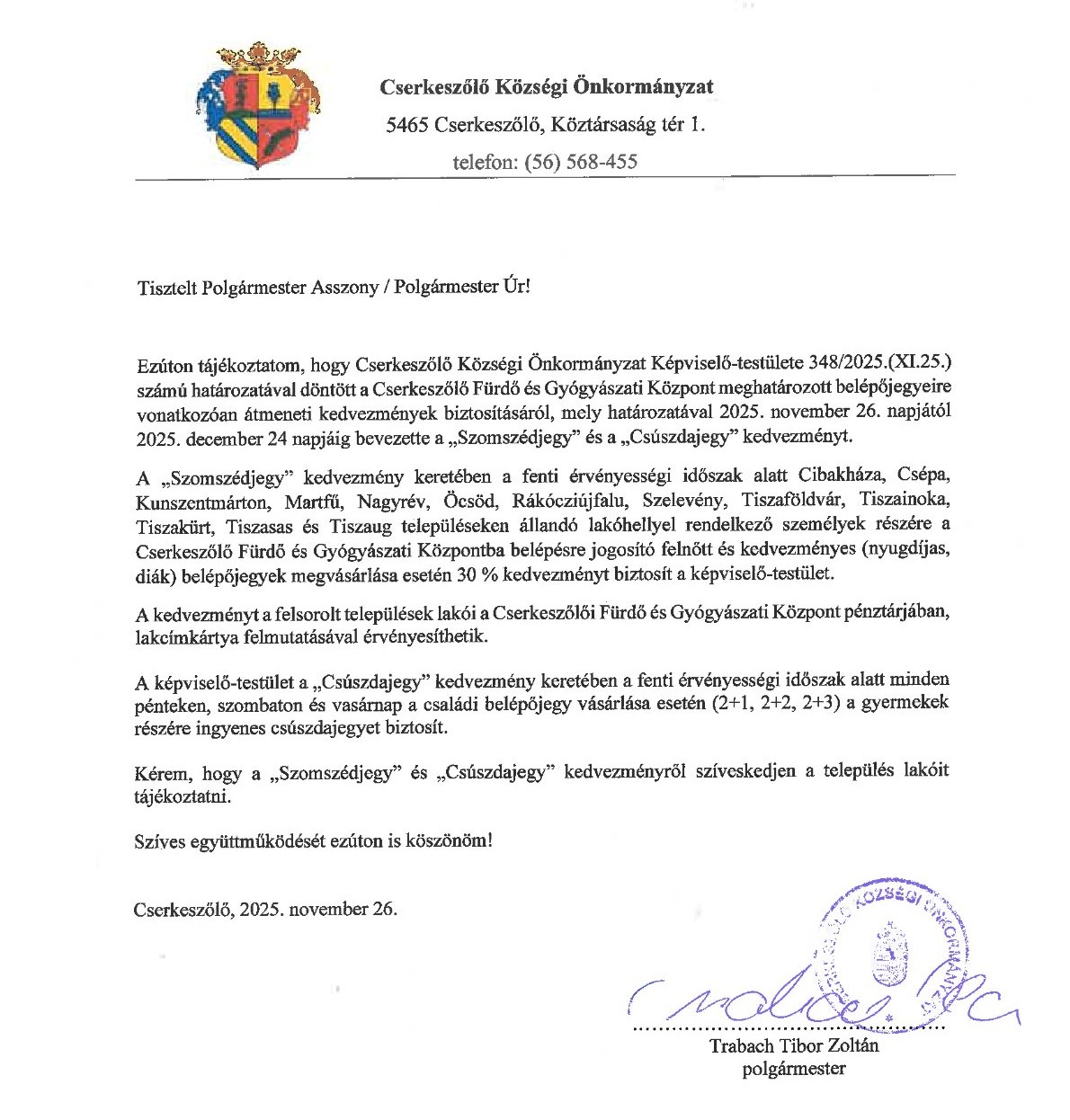 Tájékoztatjuk a Tisztelt Lakosságot, hogy Cserkeszőlő Községi Önkormányzat átmeneti kedvezményeket biztosít településünk lakosai számára, a Cserkeszőlő Fürdő és Gyógyászati Központba.